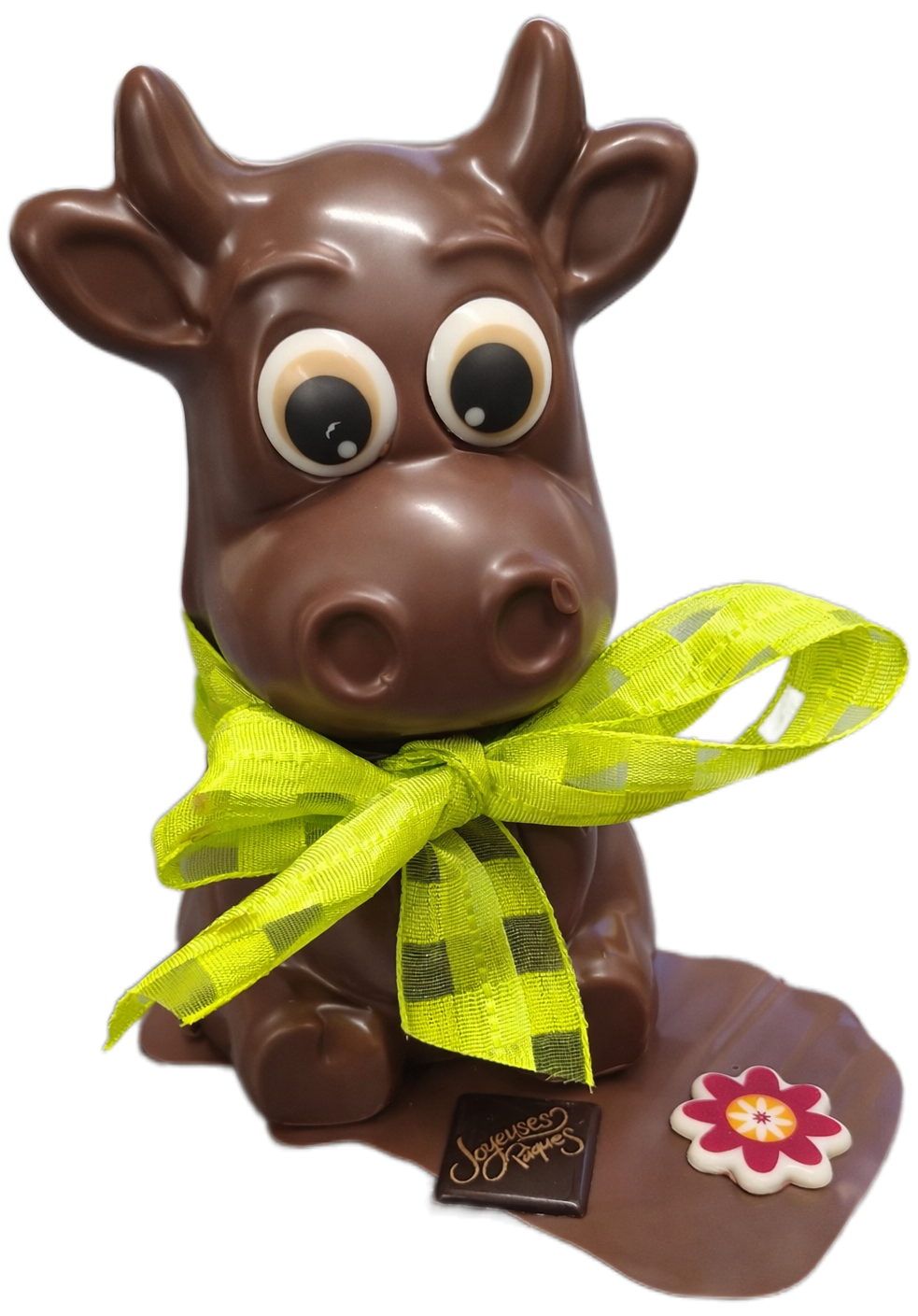 Vache en chocolat sur socle garnie de friture en chocolat et de petits oeufs pralinés